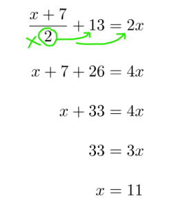 ![Rendered by QuickLaTeX.com \begin{align*}\frac{x+7}{2}+13&=2x\\[10pt]2\times \Big(\frac{x+7}{2}+13\Big)&=2\times \Big(2x\Big)\\[10pt]\frac{2(x+7)}{2}+2(13)&=4x\\[10pt]\frac{\cancel{2}(x+7)}{\cancel{2}}+26&=4x\\[10pt]x+7+26&=4x\\[10pt]x+33&=4x\\[10pt]33&=3x\\[10pt]x&=11 \end{align}](https://tentotwelvemath.com/wp-content/ql-cache/quicklatex.com-0cfba5f46f7109dcc69df4d57a0523d9_l3.png)