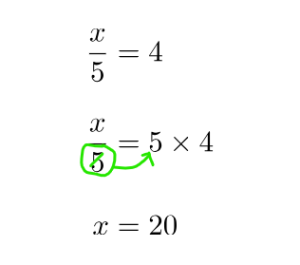 ![Rendered by QuickLaTeX.com \begin{align*}5\times \frac{x}{5}&=5\times 4\\[10pt]\cancel{5}\times \frac{x}{\cancel{5}}&=20\\[10pt] x&=20\end{align*}](https://tentotwelvemath.com/wp-content/ql-cache/quicklatex.com-aa50e2a2c34ff07aacfc6d27d20a8a44_l3.png)